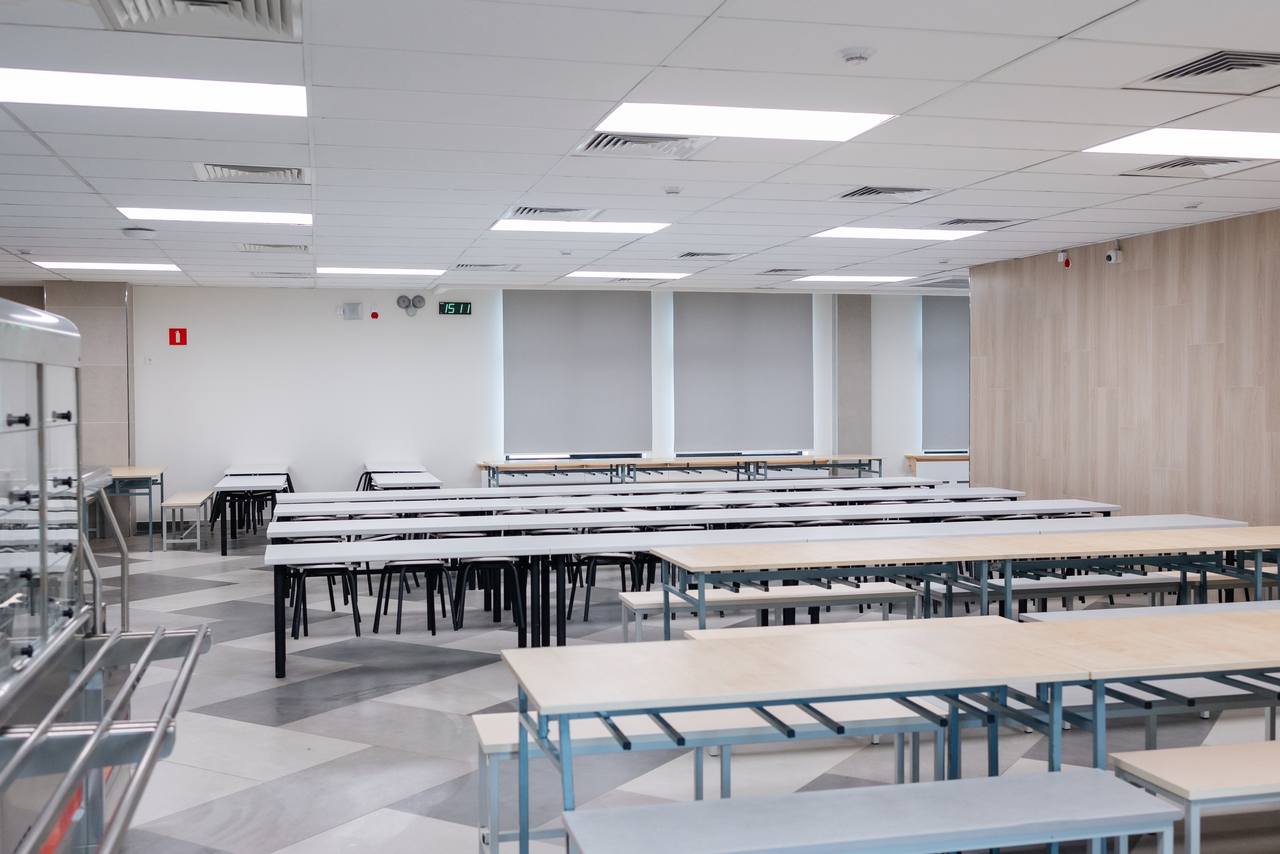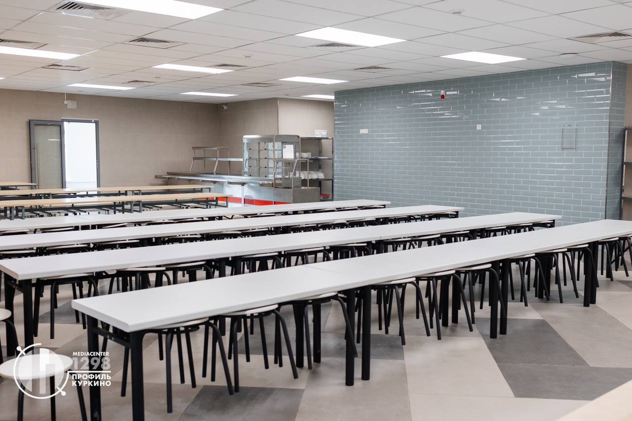 Обеденный зал выполняет функции зоны для питания школьников, пространства для общения и отдыха. Современный дизайн обеденного зала формирует комфортные условия для питания. Напомним, что каждому ученику начальной школы бесплатно предоставляется завтрак, а для обедов необходимо подать заявление на портале mos.ru. Меню всегда открыто для родителей на сайте школы.