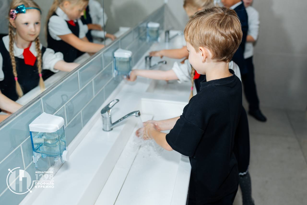 До приема пищи — дезинфекция рук. Сплошная раковина удобна в использовании, минимизирует количество брызг на полу. Рядом с раковиной размещаются диспенсеры для мыла, сушилки для рук, мусорные ведра и зеркало.